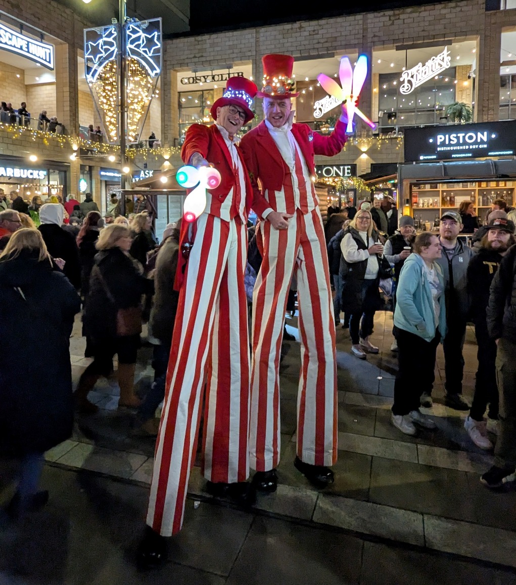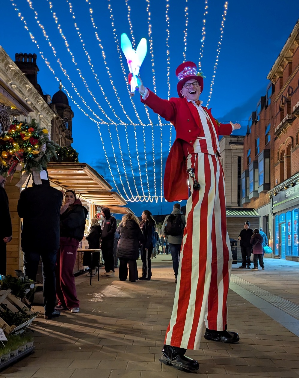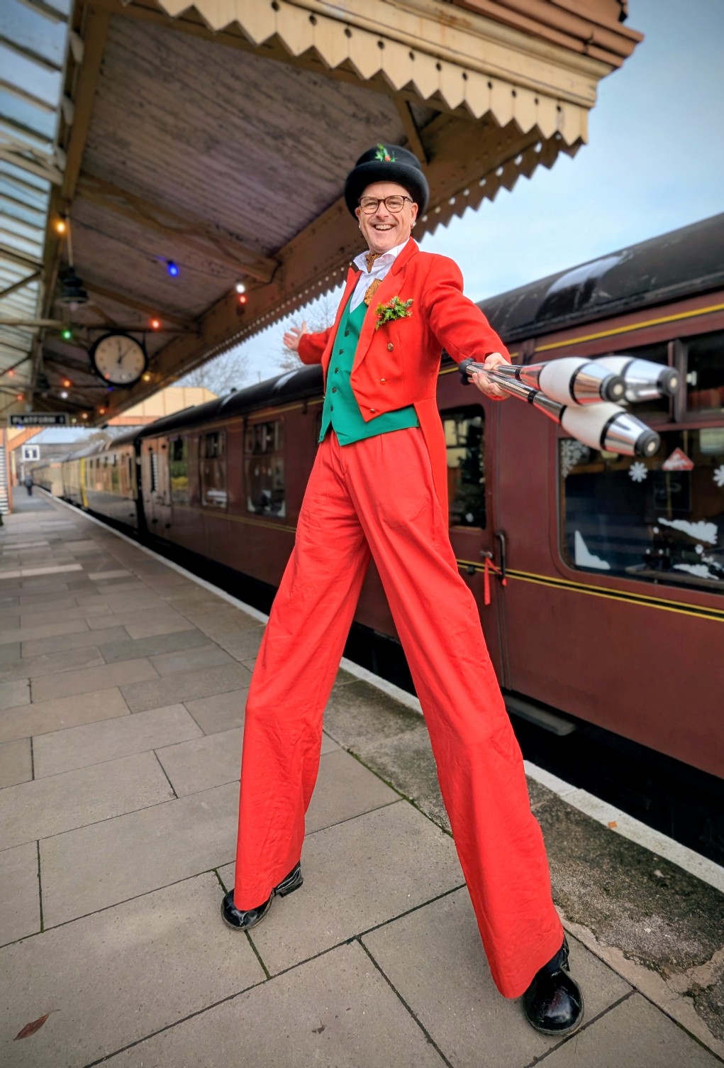Mr Dandy Doo – Victorian Gent. What a gentleman, and oh how festive. Lights and holly around that marvelous hat. Stilt walker, illuminated penny farthing or ground based. Juggling show also available. Perfect for Victorian themed Christmas events.